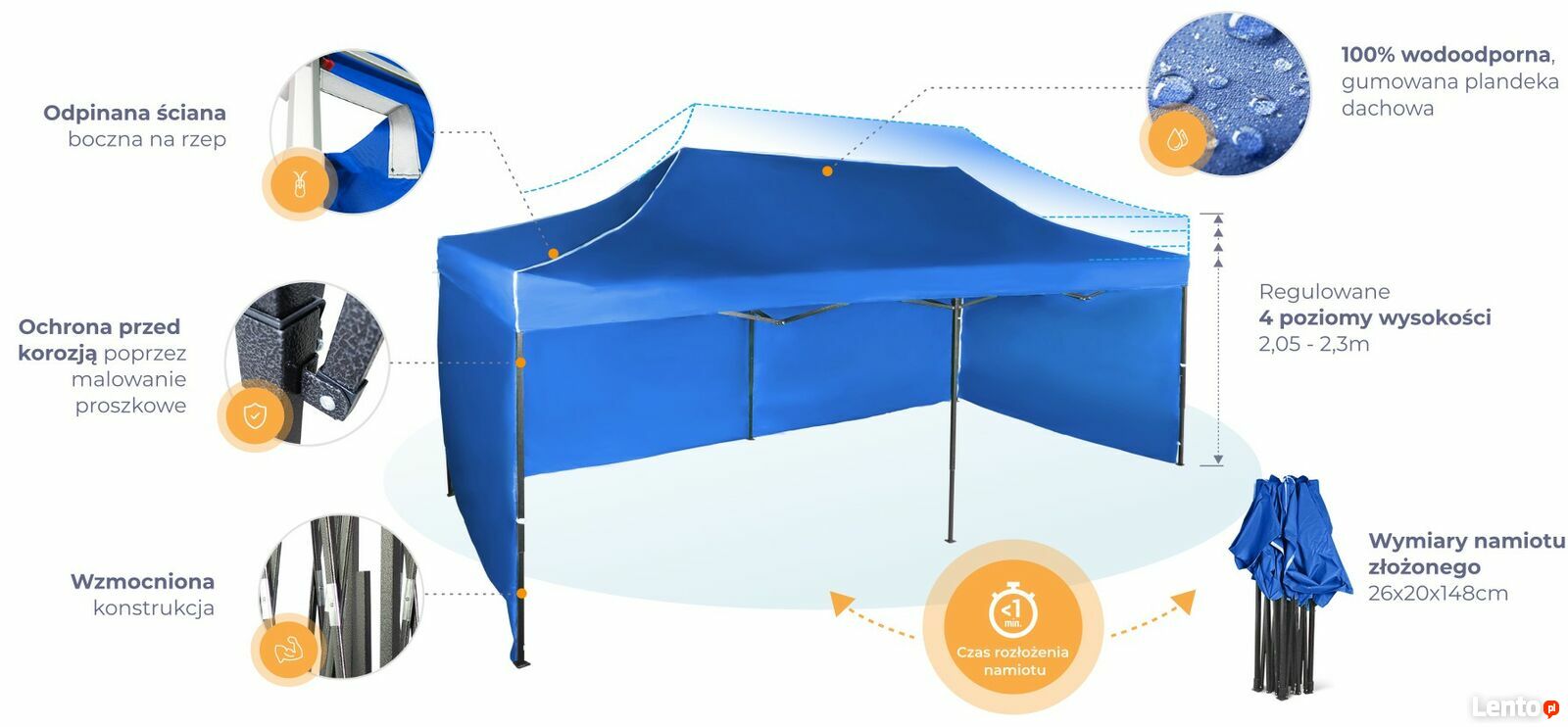Największy namiot imprezowy ekspresowy 6x3 m w naszej ofercie! Konstrukcja nożycowa zapewnia szybki montaż i demontaż – rozłożenie namiotu przez dwie osoby zajmuje zaledwie kilka minut, bez konieczności montażu rurek i używania narzędzi. Stabilność i wytrzymałość gwarantują prawidłowe zakotwienie oraz solidna konstrukcja – namiot wytrzymuje wiatr do 30 km/h.To uniwersalne rozwiązanie, które można wykorzystać w różnych sytuacjach: jako stoisko sprzedażowe, namiot eventowy na targach, tymczasowa jadalnia, zadaszenie sceny czy garaż dla samochodu podczas rajdów. W ogrodzie sprawdzi się jako altana, zapewniająca ochronę przed słońcem i deszczem. Dach namiotu jest wodoodporny, co gwarantuje komfort niezależnie od warunków atmosferycznych.